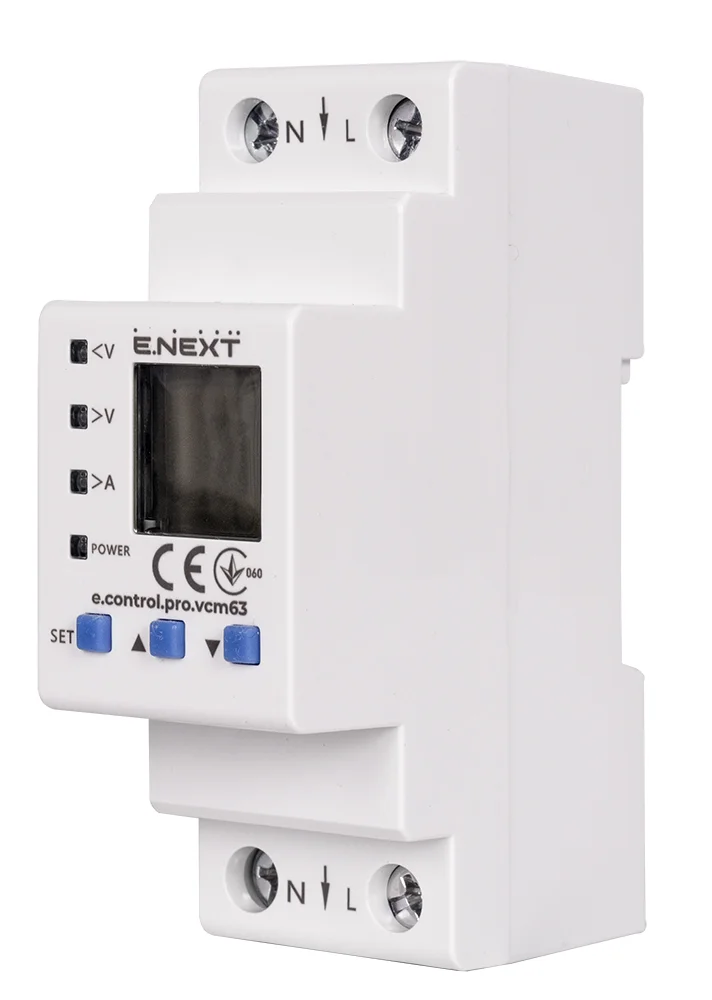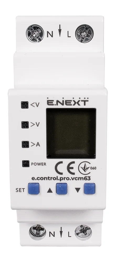 Реле контроля напряжения и тока e.control.pro.vcm63 предназначено для защиты однофазного электрического оборудования от недопустимых колебаний напряжения, защиты от перегрузки и имеет функцию записи активной мощности.