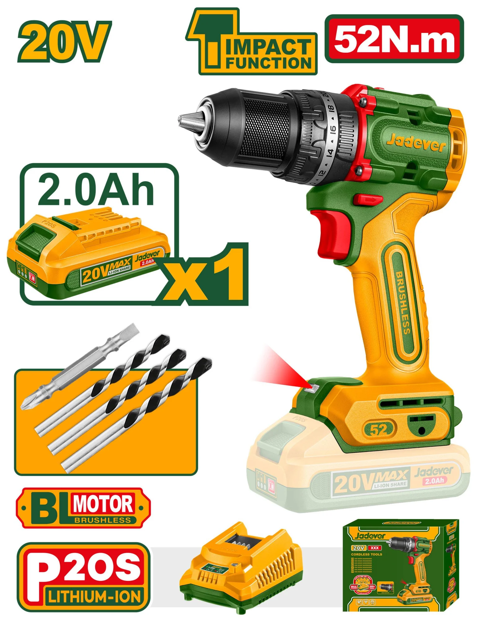 Компактная бесщеточная аккумуляторная ударная дрель 20V + 1 аккм JDCDP5282 Jadever