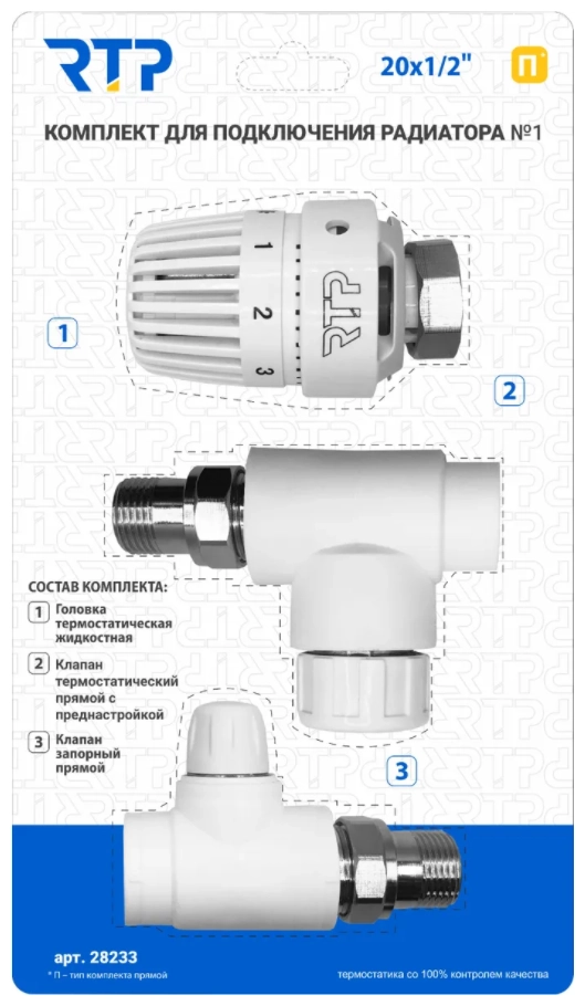 Комплект для подключения радиатора отопления I PPR RTP DN 20 мм х 1/2" прямой - Термостатический клапан, Термостатическая головка, Клапан запорный.
