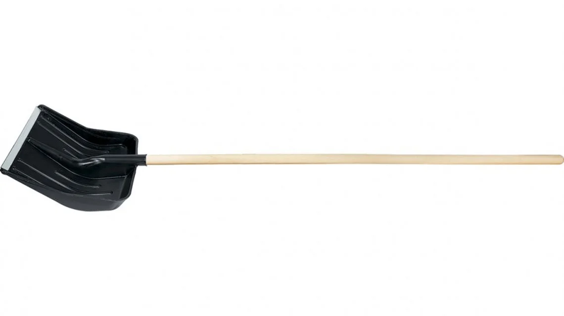 Лопата для уборки снега изготовлена из прочного пластика, устойчивого к механическим повреждениям и морозу. Ручка изготовлена из дерева. Дополнительная металлическая лента обеспечивает жесткость и защиту, что позволяет работать даже на замерзшем снегу.