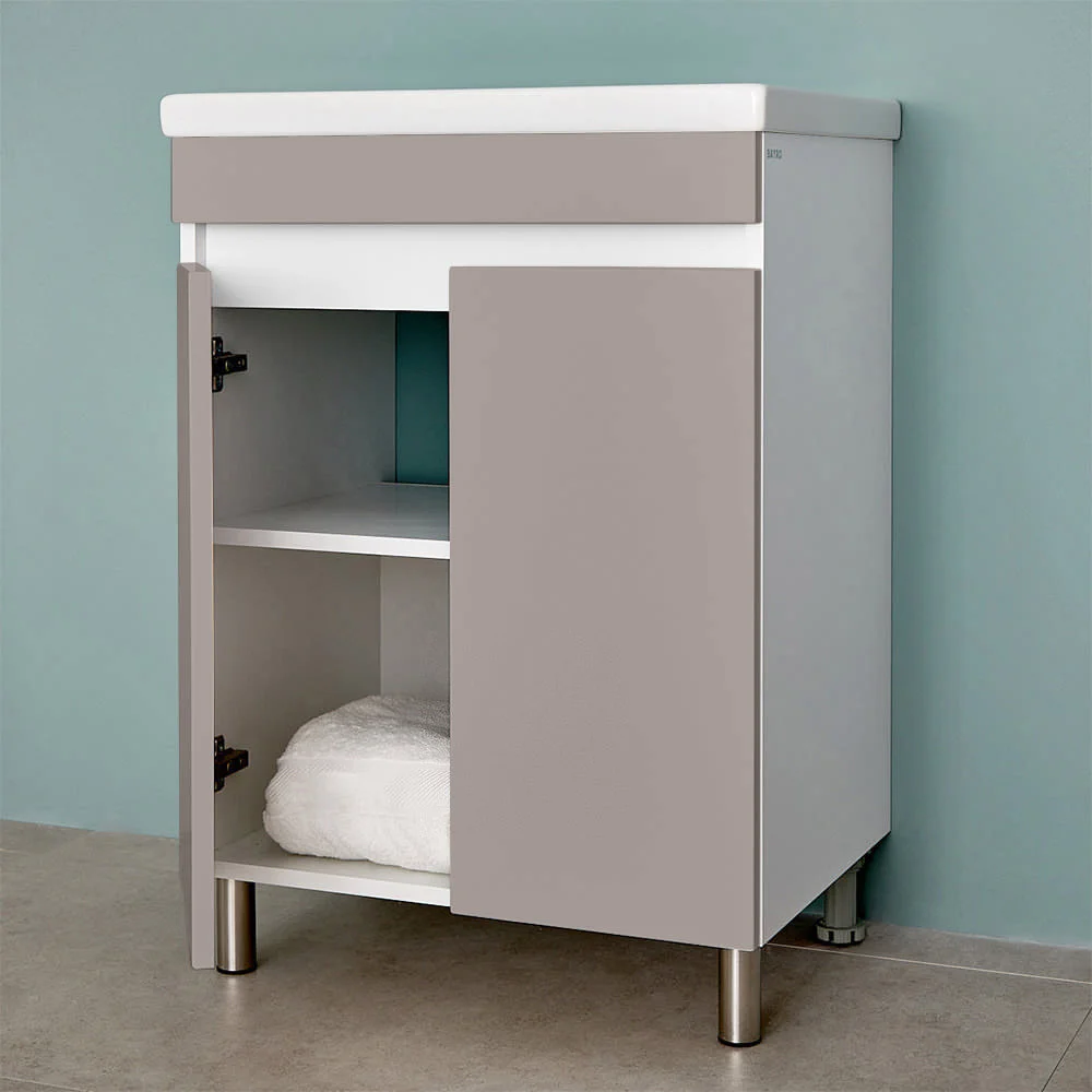 Шкаф для ванной Bayro Trend Duo напольный под умывальник. Корпус из крашенного ДСП, фасад из крашенного МДФ в цвете светло-серый мат. Имеет распашной тип открывания с механизмом плавного закрывания. Производство Молдова.