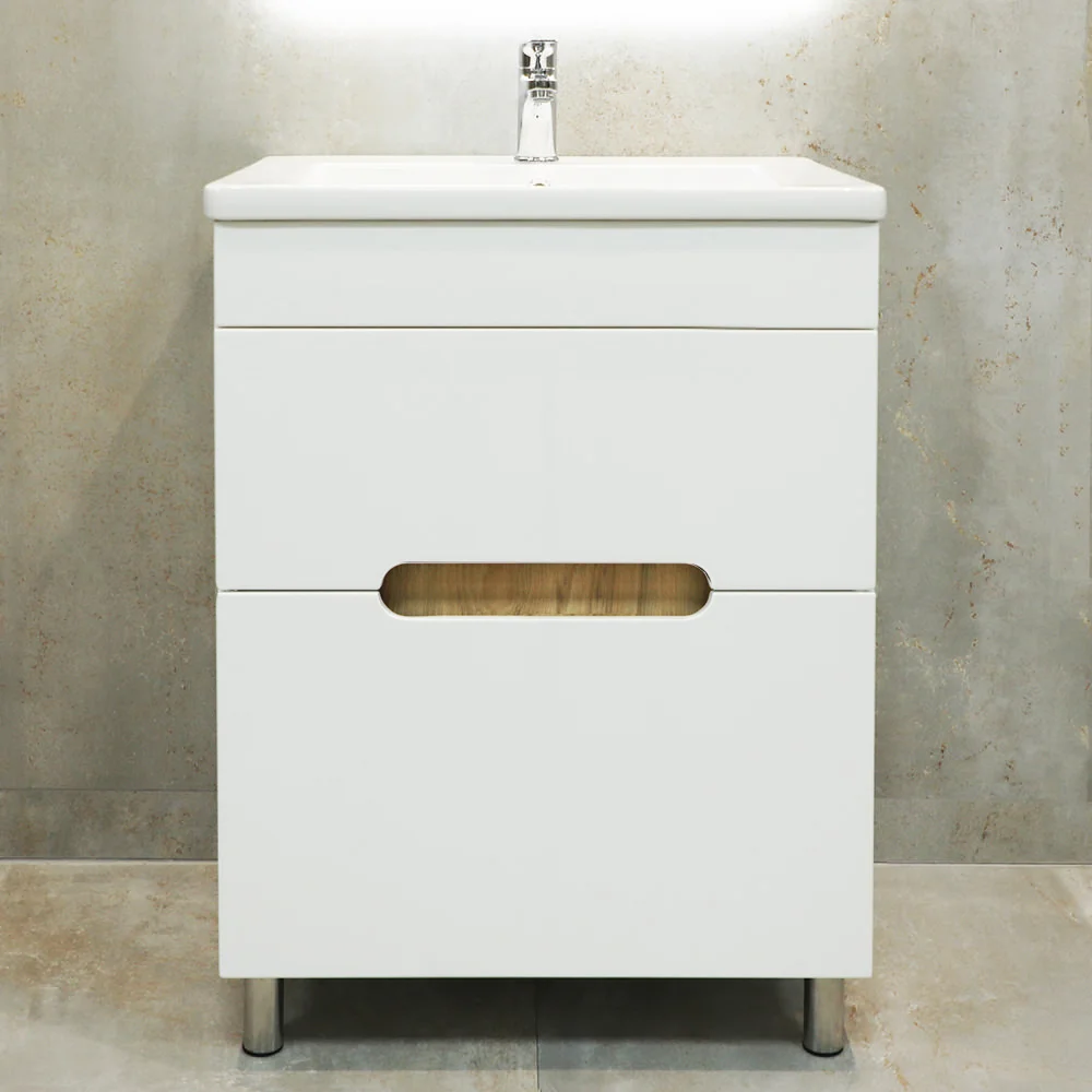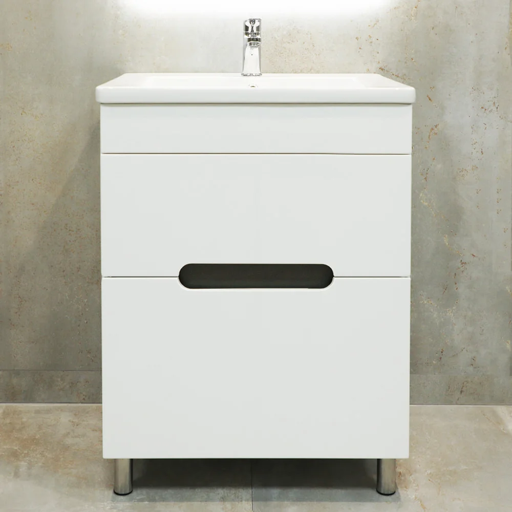 Шкаф для ванной Bayro Etna напольный под умывальник. Корпус из крашенного ДСП, фасад из крашенного МДФ в цвете белый мат. Оснащен выдвижными ящиками с механизмом плавного закрывания. Производство Молдова.
