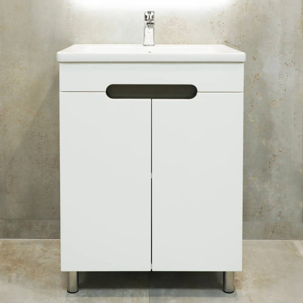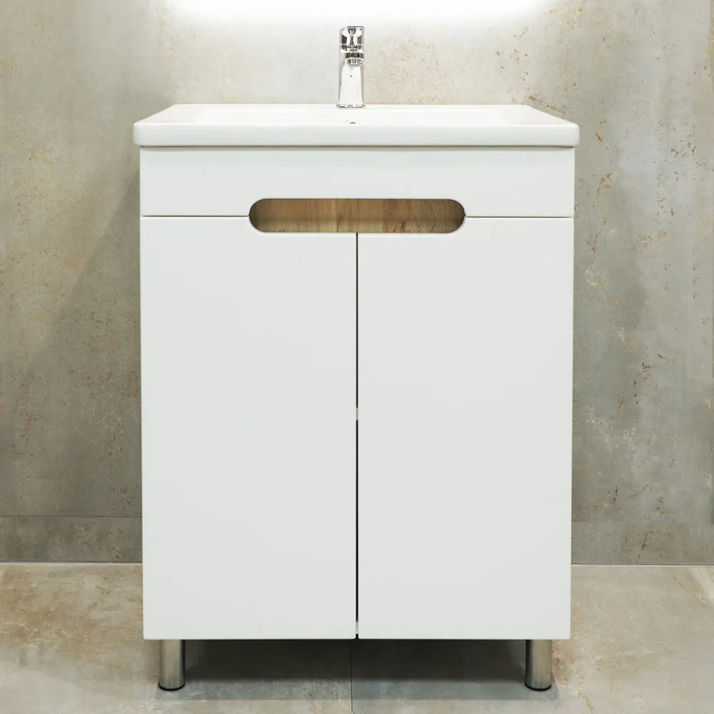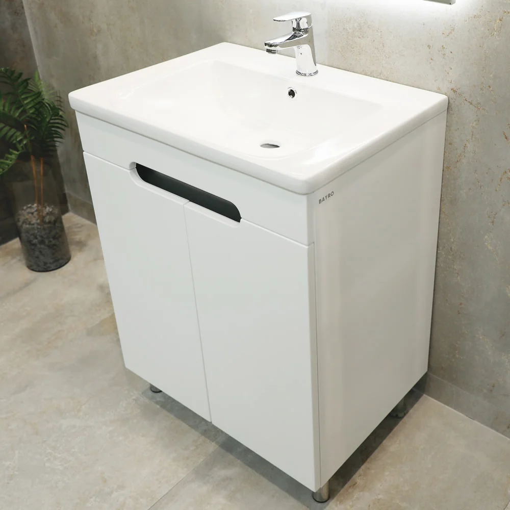 Шкаф для ванной Bayro Etna Duo напольный под умывальник. Корпус из крашенного ДСП, фасад из крашенного МДФ в цвете белый мат. Тип открывания распашной с плавным закрыванием. Производство Молдова.