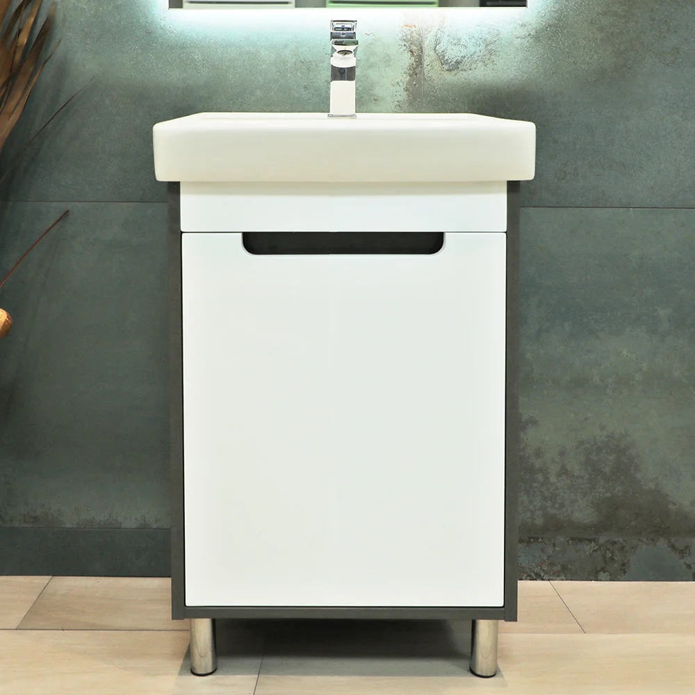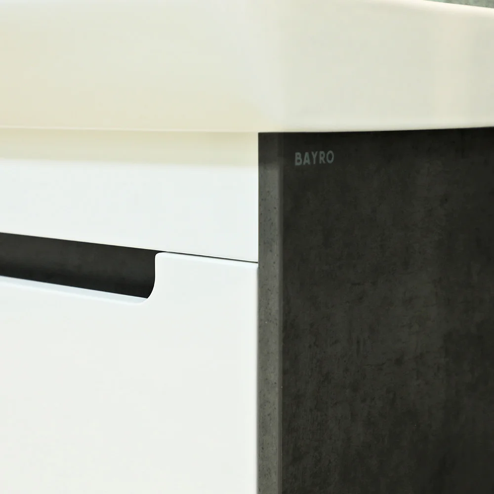 Шкаф для ванной Bayro Venus напольный под умывальник. Корпус из ЛДСП (цвет боковин: бетон чикаго тёмный), фасад из МДФ крашенного (белый, матовая поверхность). Распашной тип открывания, правая ориентация, оснащен плавным закрыванием. Страна-производитель: Молдова.