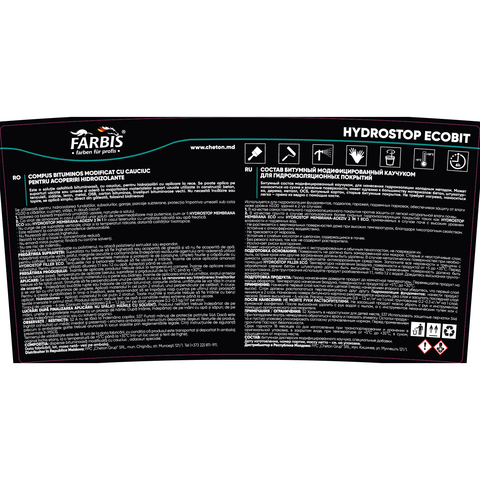 Расход гидроизоляции Hydrostop Ecobit от Farbis - 0,8-1,5 кг на м2 на один слой, грунтование 0,2-0,3 кг на м2 на один слой. Состав: Битумная дисперсия модифицированного каучука и специальные добавки.