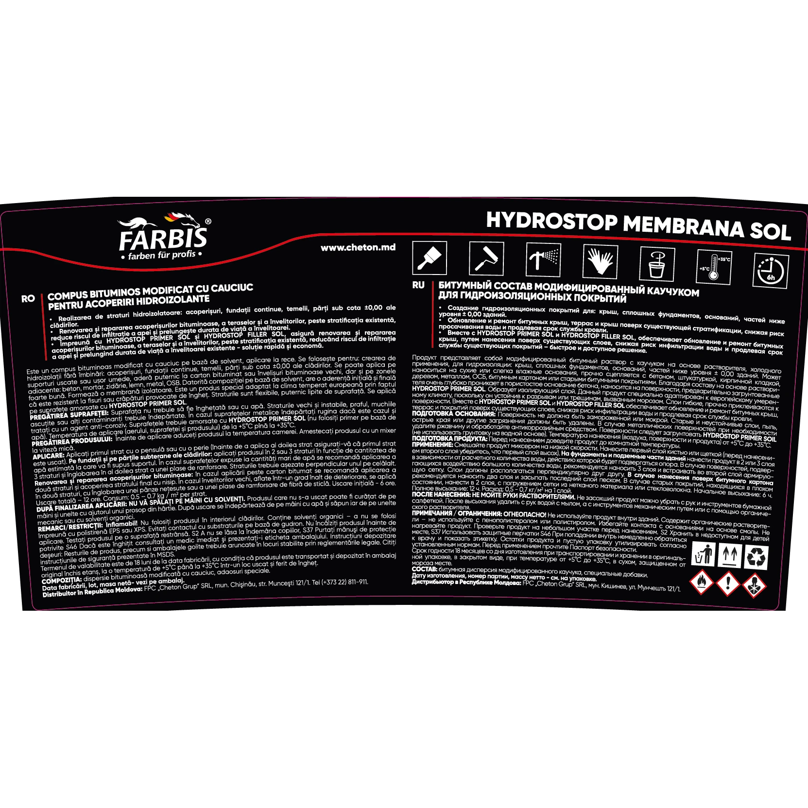 Hydrostop Membrana Sol производства компании Farbis представляет собой модифицированный битумный раствор с каучуком, на основе растворителя, холодного применения для гидроизоляции крыш, сплошных фундаментов, оснований, частей ниже нулевого уровня зданий.