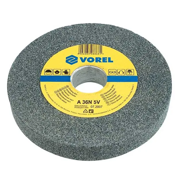 Шлифовальный круг – это абразивный инструмент, состоящий из зерен определенной фракции сцементированных между собой вяжущим веществом. 08864 от Vorel. Предназначен для обработки, шлифования, заточки изделий из металла. Диаметр внешний 150мм, внутренний 12.7мм.