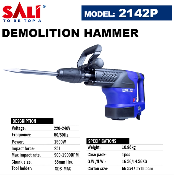 Перфоратор 1500Вт, 900-1900rpm, SDS Max 65mm Hex, 25J, SALI 2142P
