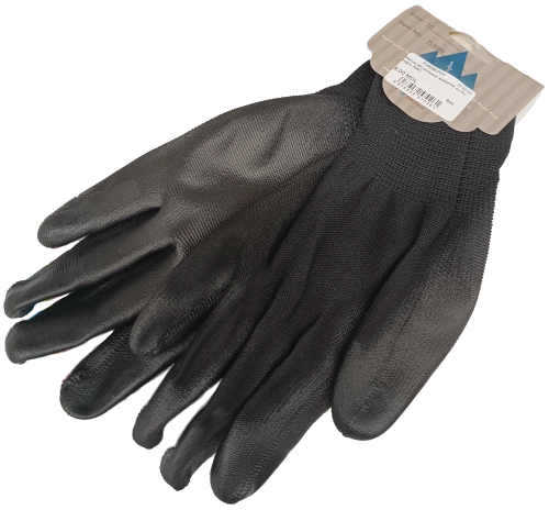 Черные перчатки из полиэстера с усиленным PU-покрытием. Устойчивы к маслам и абразивам. Подходят для слесарных работ, обработки металла и дерева.