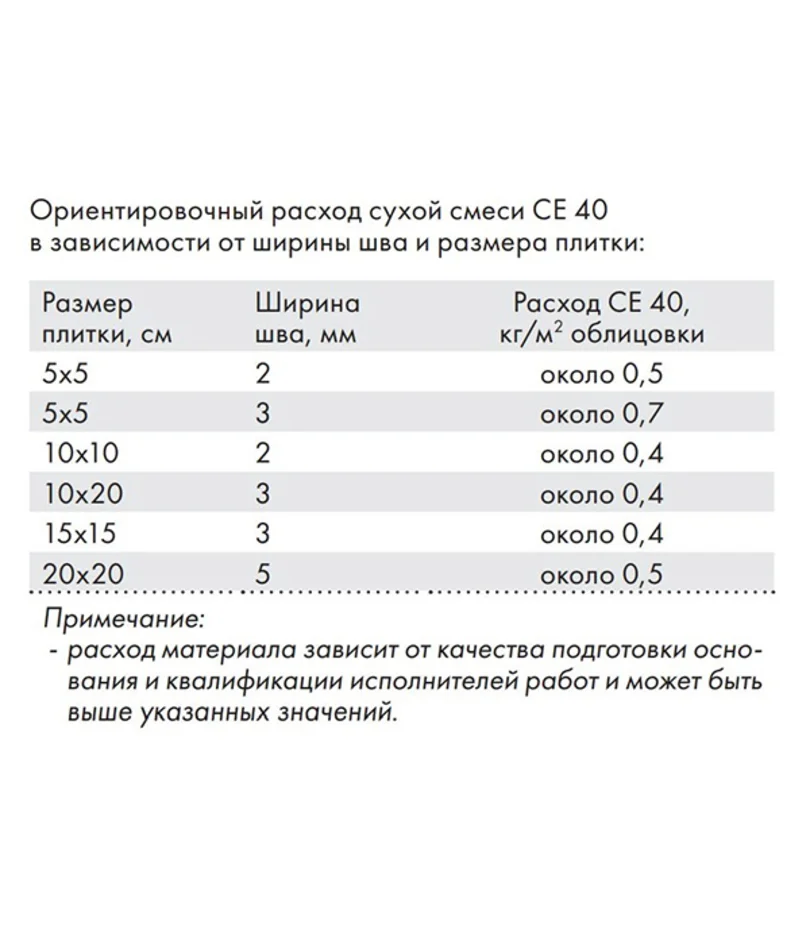 Затирка CE 40 предназначена для заполнения швов керамических, каменных (в том числе мраморных) и стеклянных облицовок на полах и стенах внутри и снаружи зданий, при ширине шва до 10 мм.