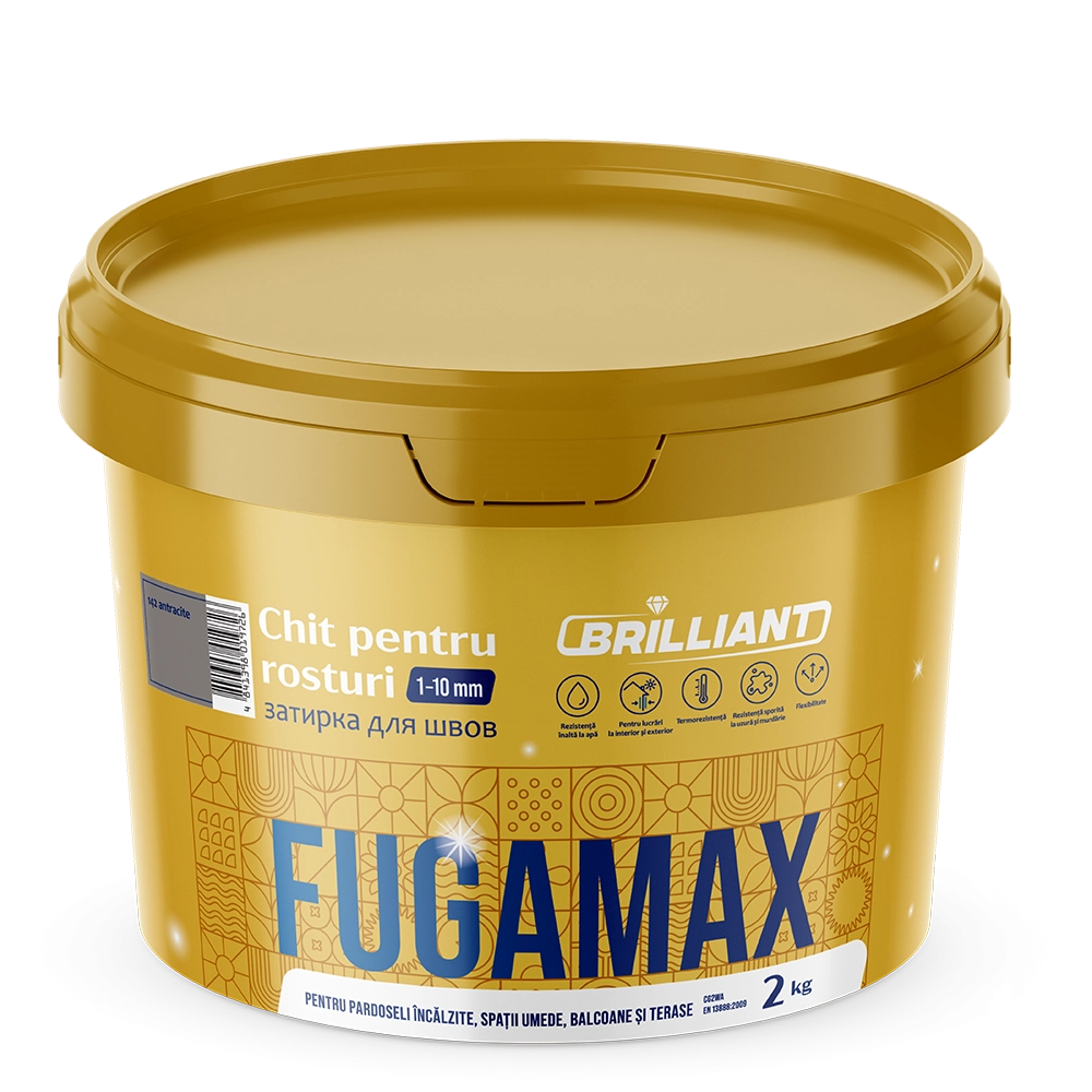 Затирка Fugamax Brilliant 1-10мм - сухая смесь на цементной основе для затирки внутренних и наружных стеновых и напольных плиточных покрытий (керамической плитки и клинкера всех видов,керамогранита,стеклянной и другой мозаики, плитки из натураль- ного и искусственного камня) в жилых, коммерческих и общественных зданиях. Подходит для заполнения швов шириной и глубиной до 10 мм, а также для напольной плитки в помещениях с подогревом пола. Отличается высокой износостойко- стью и хорошей водоотталкивающей способностью. FUGAMAX не пригодна для затирки плиточных покрытий, от которых строго требуется кислото- или щелочестойкость (плиточные покрытия промышленных объектов, ремесленных мастерских, лабораторий и т. п.), а также не соответствует требованиям, предъявляемым к затиркам для заполнения деформационных швов, облицовки плиткой бассейнов и запол- нения швов между печами и другими элементами печей для обжига керамики.