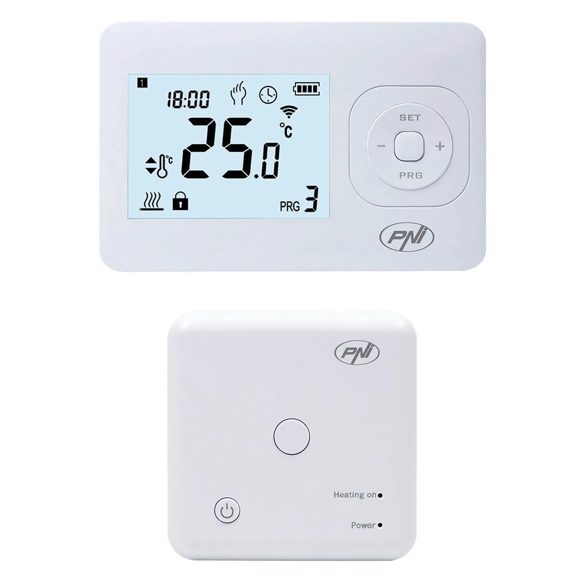 PNI CT62 — беспроводной программируемый комнатный термостат для управления котлом и поддержания стабильной температуры без «качелей». На экране всегда видно текущую и заданную температуру, время, активную программу и статус связи между блоками.
