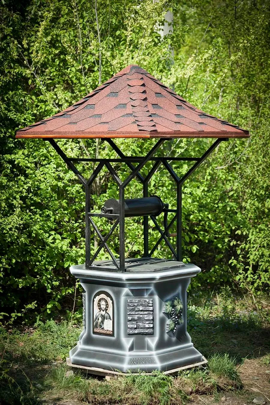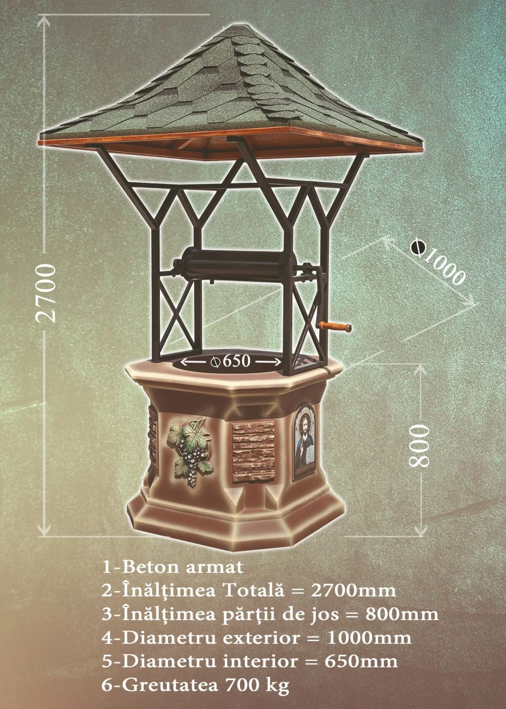 Использование сварного каркаса, как основы для колодца "Strugure" обеспечивает надежность конструкции. Многогранное кольцо из железобетона декорировано расписными гранитными вставками и окрашено качественными красками. Защитная крышка из дерева убережет воду в колодце от загрязнения. Цельная конструкция экономит драгоценное время при монтаже.