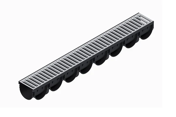 Пластиковый, высотой 100мм, с решеткой из оцинкованной стали, предназначается для устройства систем поверхностного водоотведения в пешеходных зонах, класс нагрузки А15 (15 kN/м2) согласно EN 1433, с интенсивным трафиком движения пешеходов.