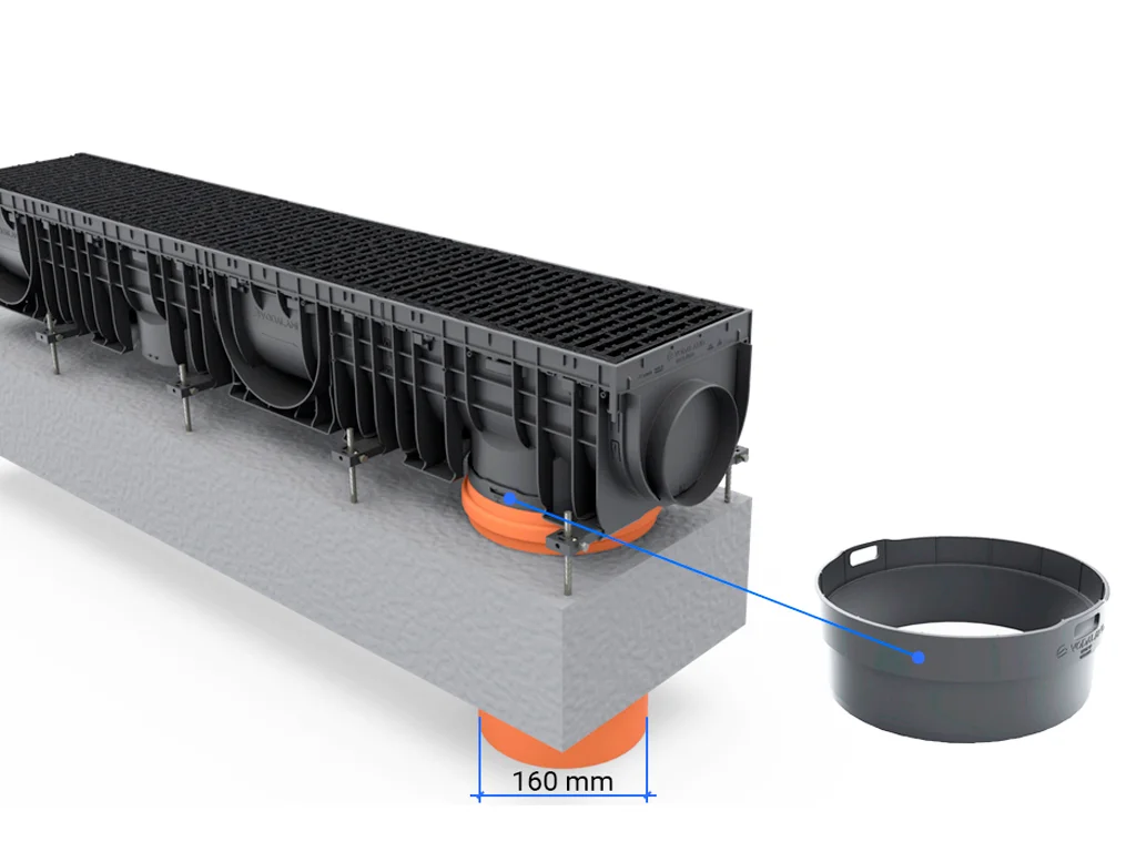 Пластиковый адаптер, предназначенный для вертикального подключения лотков Base DN150 к канализационной трубе диаметром 160 мм.