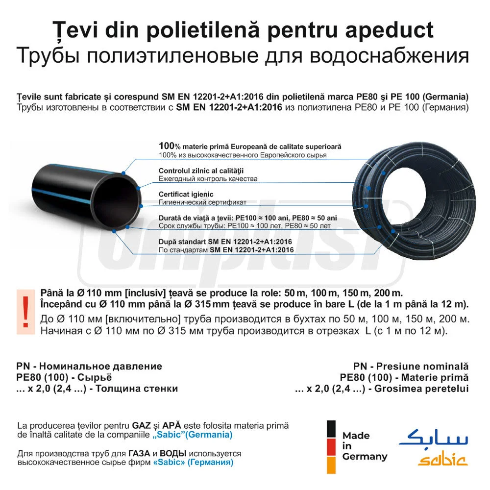 Изготовлены в соответствии с SM EN 12201-2+A1:2016 из полиэтилена PE80 и PE100